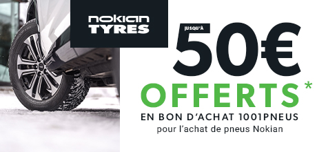 Dans le cadre de cette opération promotionnelle, 1001Pneus propose un bon d’achat allant jusqu’à 50€, valable sur la marque NOKIAN, selon les conditions détaillées ci-dessous.
